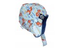 Dvouvrstvá černá ušanka s modrým štítkem.