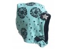 Dvouvrstvá černá ušanka s petrolejovým štítkem.