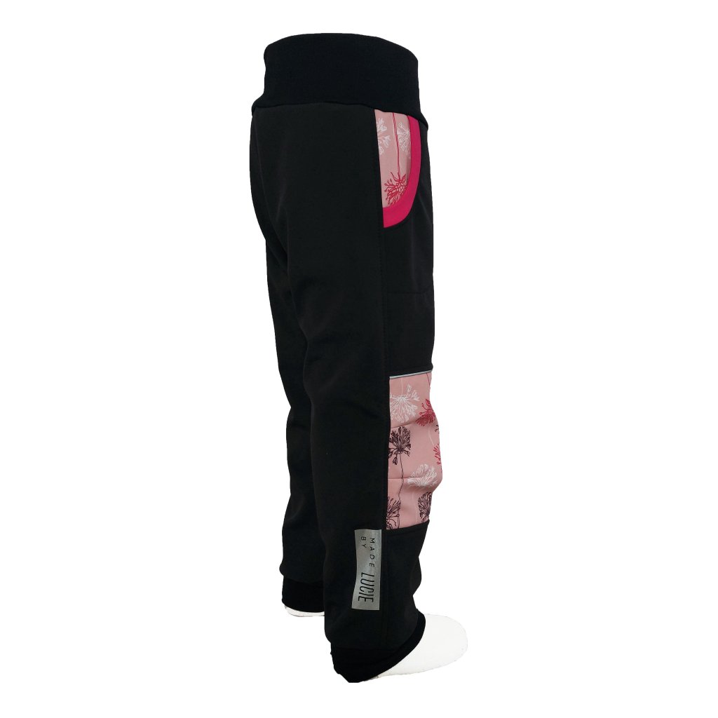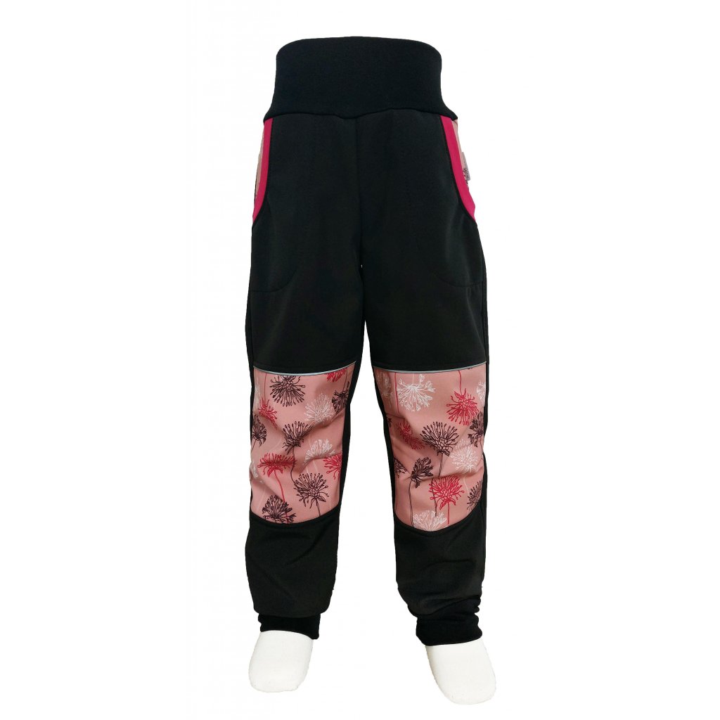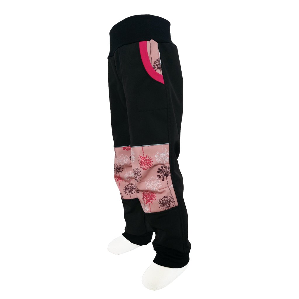 Softshellové kalhoty ze softshellu s fleecem s motivem pampelišek na kolenou, přední a zadní díly s náplety jsou černé. Kapsy lemované růžovou.